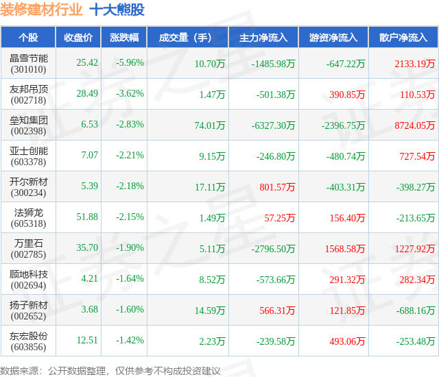 个股表现方面,装修建材行业当日领跌股为晶雪节能(301010),该股当日报收25.42,下跌5.96%,成交量10.7万,主力资金净流出1485.98万元。友邦吊顶(002718)以下跌3.62%紧随其后,该股当日成交量1.47万,主力资金净流出501.38万元。除此之外,垒知集团(002398)、亚士创能(603378)、开尔新材(300234)均进入当日熊股之列。具体个股列表见下表: