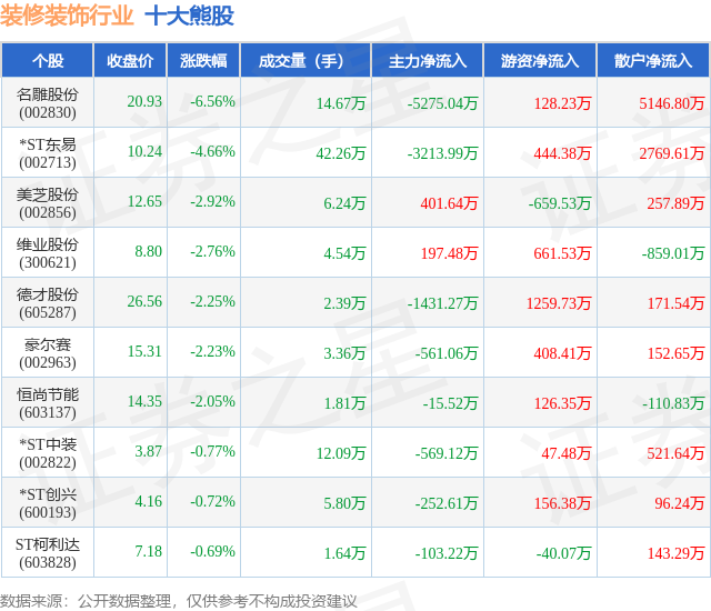 个股表现方面,装修装饰行业当日领跌股为名雕股份(002830),该股当日报收20.93,下跌6.56%,成交量14.67万,主力资金净流出5275.04万元。*ST东易(002713)以下跌4.66%紧随其后,该股当日成交量42.26万,主力资金净流出3213.99万元。除此之外,美芝股份(002856)、维业股份(300621)、德才股份(605287)均进入当日熊股之列。具体个股列表见下表: