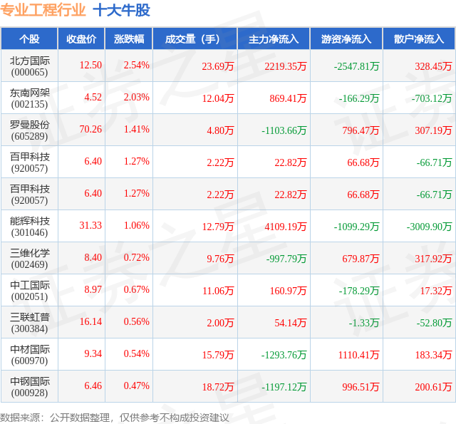 个股表现方面,专业工程行业当日领涨股为北方国际(000065),该股当日报收12.5,上涨2.54%,成交量23.69万,主力资金净流入2219.35万元。东南网架(002135)以上涨2.03%紧随其后,该股当日成交量12.04万,主力资金净流入869.41万元。除此之外,罗曼股份(605289)、百甲科技(920057)、百甲科技(920057)均进入当日牛股之列。具体个股列表见下表: