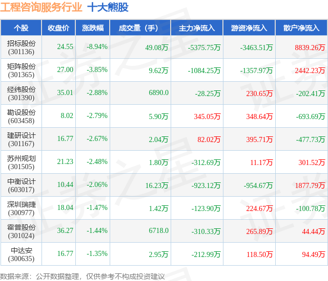 个股表现方面,工程咨询服务行业当日领跌股为招标股份(301136),该股当日报收24.55,下跌8.94%,成交量49.08万,主力资金净流出5375.75万元。矩阵股份(301365)以下跌3.85%紧随其后,该股当日成交量9.62万,主力资金净流出1084.25万元。除此之外,经纬股份(301390)、勘设股份(603458)、建研设计(301167)均进入当日熊股之列。具体个股列表见下表: