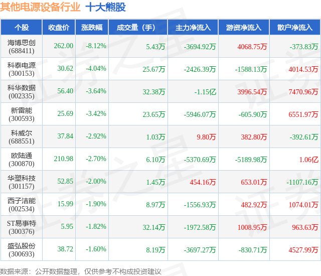 个股表现方面,其他电源设备行业当日领跌股为海博思创(688411),该股当日报收262.0,下跌8.12%,成交量5.43万,主力资金净流出3694.92万元。科泰电源(300153)以下跌4.04%紧随其后,该股当日成交量25.67万,主力资金净流出2426.39万元。除此之外,科华数据(002335)、新雷能(300593)、科威尔(688551)均进入当日熊股之列。具体个股列表见下表: