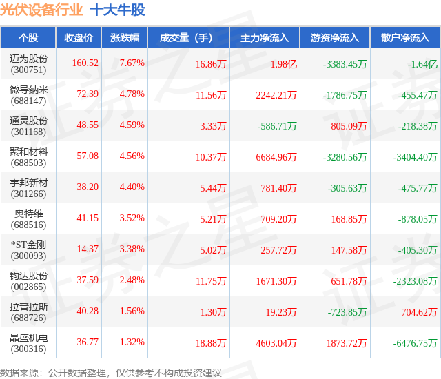 个股表现方面,光伏设备行业当日领涨股为迈为股份(300751),该股当日报收160.52,上涨7.67%,成交量16.86万,主力资金净流入1.98亿元。微导纳米(688147)以上涨4.78%紧随其后,该股当日成交量11.56万,主力资金净流入2242.21万元。除此之外,通灵股份(301168)、聚和材料(688503)、宇邦新材(301266)均进入当日牛股之列。具体个股列表见下表: