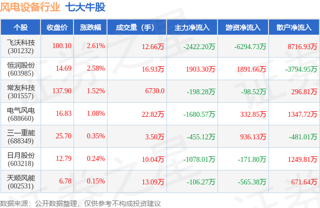 个股表现方面,风电设备行业当日领涨股为飞沃科技(301232),该股当日报收100.1,上涨2.61%,成交量12.66万,主力资金净流出2422.2万元。恒润股份(603985)以上涨2.58%紧随其后,该股当日成交量16.93万,主力资金净流入1903.3万元。除此之外,常友科技(301557)、电气风电(688660)、三一重能(688349)均进入当日牛股之列。具体个股列表见下表:
