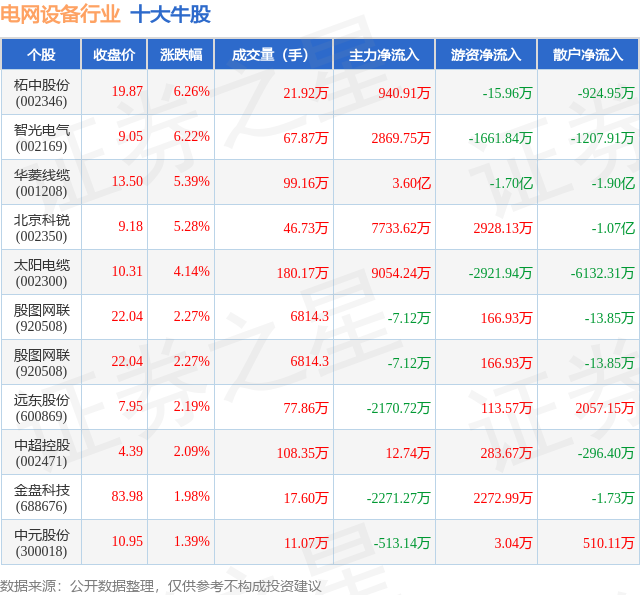 个股表现方面,电网设备行业当日领涨股为柘中股份(002346),该股当日报收19.87,上涨6.26%,成交量21.92万,主力资金净流入940.91万元。智光电气(002169)以上涨6.22%紧随其后,该股当日成交量67.87万,主力资金净流入2869.75万元。除此之外,华菱线缆(001208)、北京科锐(002350)、太阳电缆(002300)均进入当日牛股之列。具体个股列表见下表: