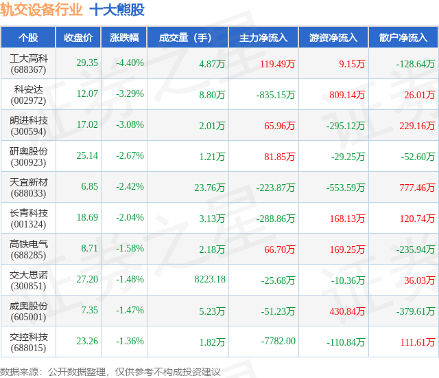 个股表现方面,轨交设备行业当日领跌股为工大高科(688367),该股当日报收29.35,下跌4.4%,成交量4.87万,主力资金净流入119.49万元。科安达(002972)以下跌3.29%紧随其后,该股当日成交量8.8万,主力资金净流出835.15万元。除此之外,朗进科技(300594)、研奥股份(300923)、天宜新材(688033)均进入当日熊股之列。具体个股列表见下表: