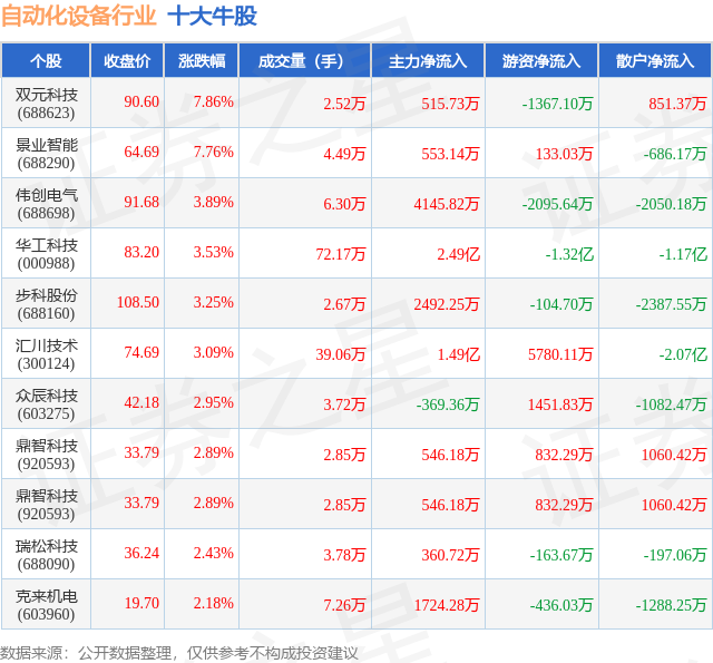 个股表现方面,自动化设备行业当日领涨股为双元科技(688623),该股当日报收90.6,上涨7.86%,成交量2.52万,主力资金净流入515.73万元。景业智能(688290)以上涨7.76%紧随其后,该股当日成交量4.49万,主力资金净流入553.14万元。除此之外,伟创电气(688698)、华工科技(000988)、步科股份(688160)均进入当日牛股之列。具体个股列表见下表: