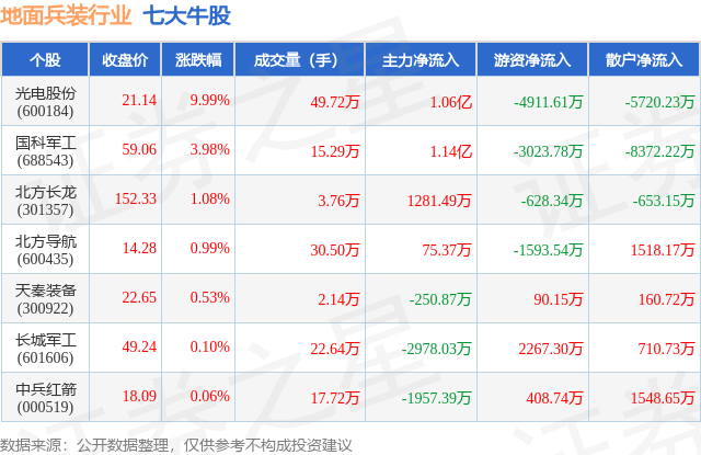 个股表现方面,地面兵装行业当日领涨股为光电股份(600184),该股当日报收21.14,上涨9.99%,成交量49.72万,主力资金净流入1.06亿元。国科军工(688543)以上涨3.98%紧随其后,该股当日成交量15.29万,主力资金净流入1.14亿元。除此之外,北方长龙(301357)、北方导航(600435)、天秦装备(300922)均进入当日牛股之列。具体个股列表见下表: