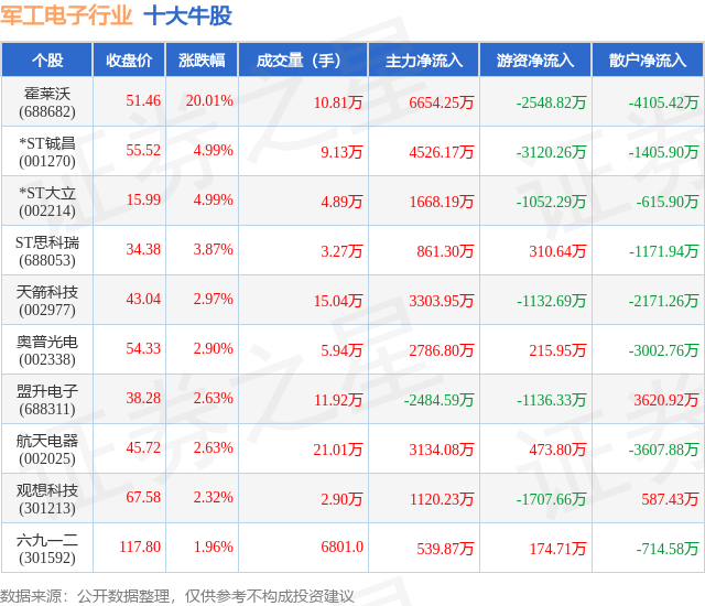 个股表现方面,军工电子行业当日领涨股为霍莱沃(688682),该股当日报收51.46,上涨20.01%,成交量10.81万,主力资金净流入6654.25万元。*ST铖昌(001270)以上涨4.99%紧随其后,该股当日成交量9.13万,主力资金净流入4526.17万元。除此之外,*ST大立(002214)、ST思科瑞(688053)、天箭科技(002977)均进入当日牛股之列。具体个股列表见下表:
