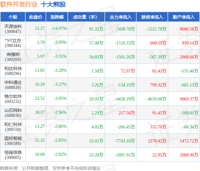 个股表现方面,软件开发行业当日领跌股为天源迪科(300047),该股当日报收12.27,下跌14.97%,成交量91.31万,主力资金净流出7438.78万元。*ST立方(300344)以下跌3.95%紧随其后,该股当日成交量57.48万,主力资金净流出1510.33万元。除此之外,有棵树(300209)、和达科技(688296)、中科通达(688038)均进入当日熊股之列。具体个股列表见下表: