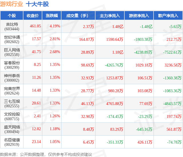 个股表现方面,游戏行业当日领涨股为吉比特(603444),该股当日报收461.05,上涨4.19%,成交量2.37万,主力资金净流入1.48亿元。世纪华通(002602)以上涨2.81%紧随其后,该股当日成交量164.07万,主力资金净流入1590.64万元。除此之外,巨人网络(002558)、富春股份(300299)、神州泰岳(300002)均进入当日牛股之列。具体个股列表见下表: