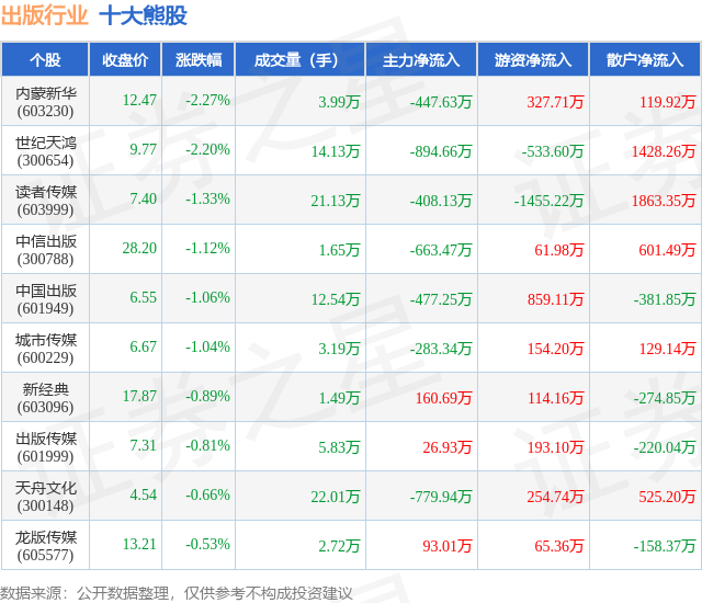 个股表现方面,出版行业当日领跌股为内蒙新华(603230),该股当日报收12.47,下跌2.27%,成交量3.99万,主力资金净流出447.63万元。世纪天鸿(300654)以下跌2.2%紧随其后,该股当日成交量14.13万,主力资金净流出894.66万元。除此之外,读者传媒(603999)、中信出版(300788)、中国出版(601949)均进入当日熊股之列。具体个股列表见下表: