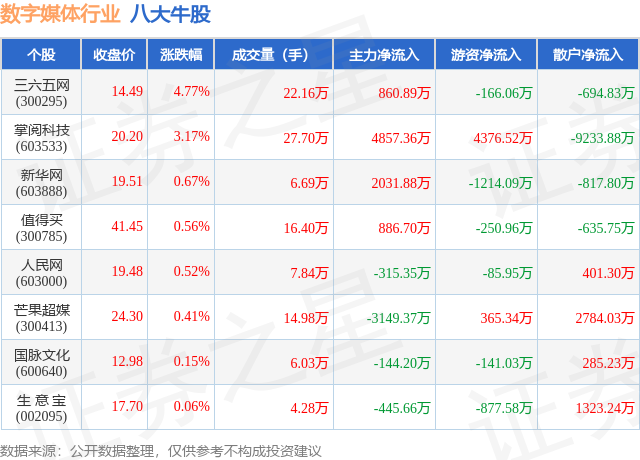 个股表现方面,数字媒体行业当日领涨股为三六五网(300295),该股当日报收14.49,上涨4.77%,成交量22.16万,主力资金净流入860.89万元。掌阅科技(603533)以上涨3.17%紧随其后,该股当日成交量27.7万,主力资金净流入4857.36万元。除此之外,新华网(603888)、值得买(300785)、人民网(603000)均进入当日牛股之列。具体个股列表见下表: