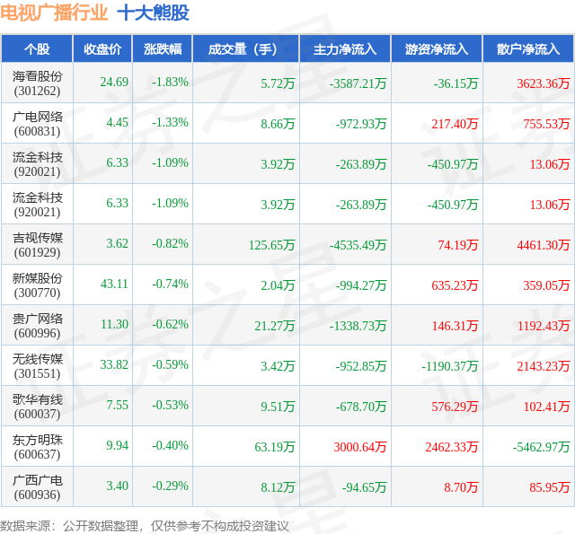 个股表现方面,电视广播行业当日领跌股为海看股份(301262),该股当日报收24.69,下跌1.83%,成交量5.72万,主力资金净流出3587.21万元。广电网络(600831)以下跌1.33%紧随其后,该股当日成交量8.66万,主力资金净流出972.93万元。除此之外,流金科技(920021)、流金科技(920021)、吉视传媒(601929)均进入当日熊股之列。具体个股列表见下表: