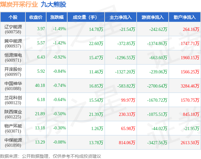 个股表现方面,煤炭开采行业当日领跌股为辽宁能源(600758),该股当日报收3.97,下跌1.49%,成交量14.78万,主力资金净流出21.54万元。冀中能源(000937)以下跌1.42%紧随其后,该股当日成交量22.6万,主力资金净流出372.85万元。除此之外,恒源煤电(600971)、开滦股份(600997)、中国神华(601088)均进入当日熊股之列。具体个股列表见下表: