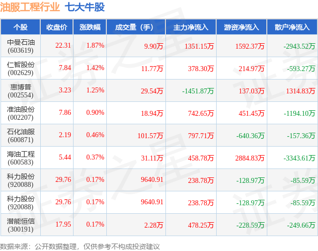个股表现方面,油服工程行业当日领涨股为中曼石油(603619),该股当日报收22.31,上涨1.87%,成交量9.9万,主力资金净流入1351.15万元。仁智股份(002629)以上涨1.42%紧随其后,该股当日成交量11.77万,主力资金净流入378.3万元。除此之外,惠博普(002554)、准油股份(002207)、石化油服(600871)均进入当日牛股之列。具体个股列表见下表: