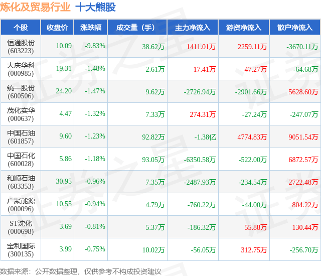 个股表现方面,炼化及贸易行业当日领跌股为恒通股份(603223),该股当日报收10.09,下跌9.83%,成交量38.62万,主力资金净流入1411.01万元。大庆华科(000985)以下跌1.48%紧随其后,该股当日成交量2.61万,主力资金净流入17.41万元。除此之外,统一股份(600506)、茂化实华(000637)、中国石油(601857)均进入当日熊股之列。具体个股列表见下表: