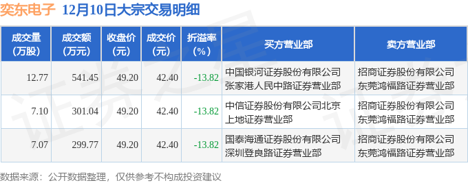 证券之星消息,12月10日奕东电子发生大宗交易,交易数据如下: