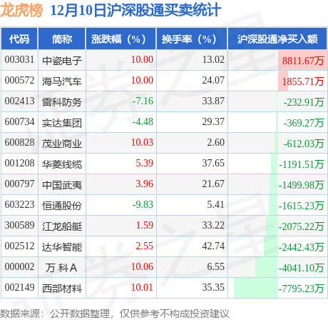 龙虎榜中有沪股通/深股通专用席位(北向资金)现身的个股共12家,其中中瓷电子以净买入8811.67万元排名第一。详情见下表: