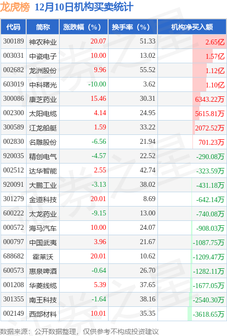 当日公布的交易所龙虎榜中有机构专用席位现身的个股共26家,其中神农种业以净买入2.65亿元排名第一。详情见下表: