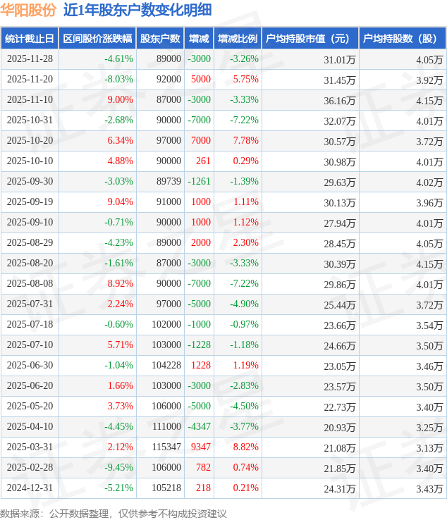 从股价来看,2025年11月20日至2025年11月28日,华阳股份区间跌幅为4.61%,在此期间股东户数减少3000.0户,减幅为3.26%。