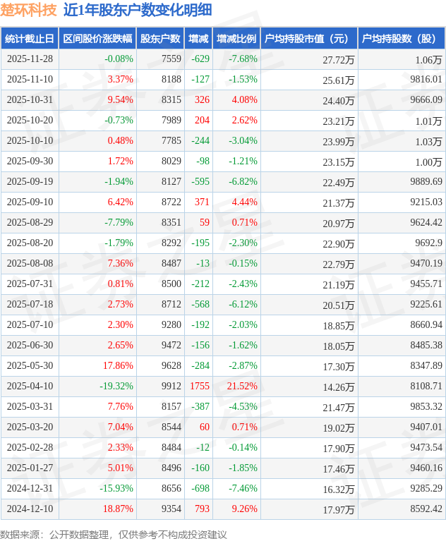 从股价来看,2025年11月10日至2025年11月28日,楚环科技区间跌幅为0.08%,在此期间股东户数减少629.0户,减幅为7.68%。