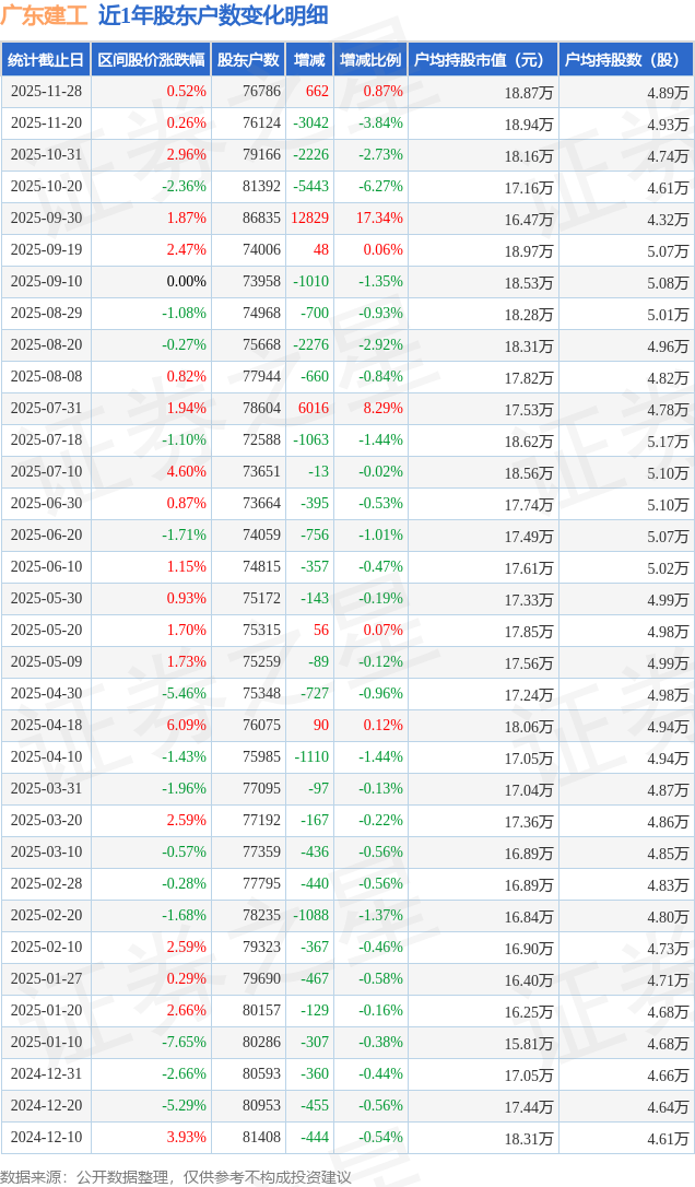 从股价来看,2025年11月20日至2025年11月28日,广东建工区间涨幅为0.52%,在此期间股东户数增加662.0户,增幅为0.87%。