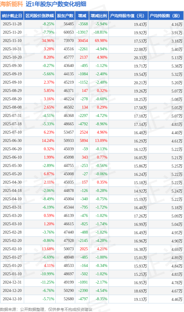 从股价来看,2025年11月20日至2025年11月28日,海新能科区间跌幅为8.25%,在此期间股东户数减少3568.0户,减幅为5.94%。