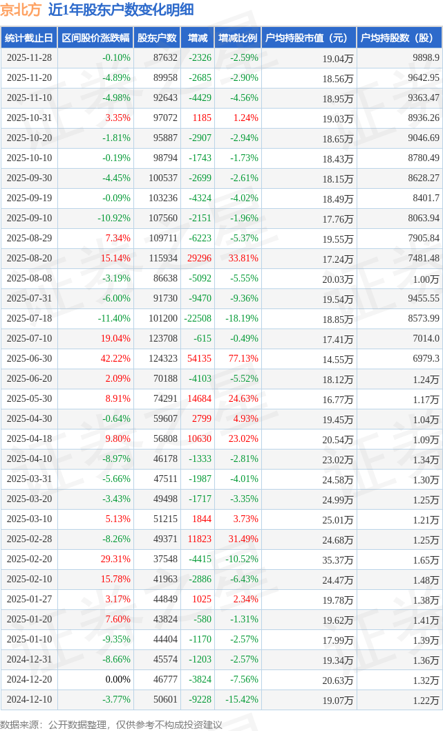 从股价来看,2025年11月20日至2025年11月28日,京北方区间跌幅为0.1%,在此期间股东户数减少2326.0户,减幅为2.59%。