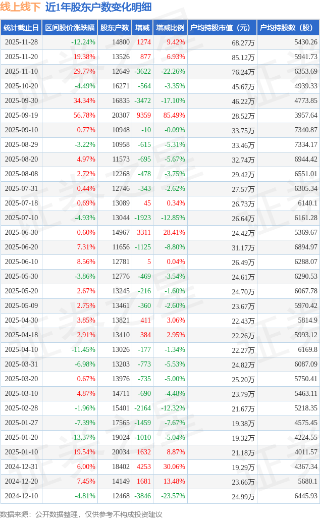 从股价来看,2025年11月20日至2025年11月28日,线上线下区间跌幅为12.24%,在此期间股东户数增加1274.0户,增幅为9.42%。