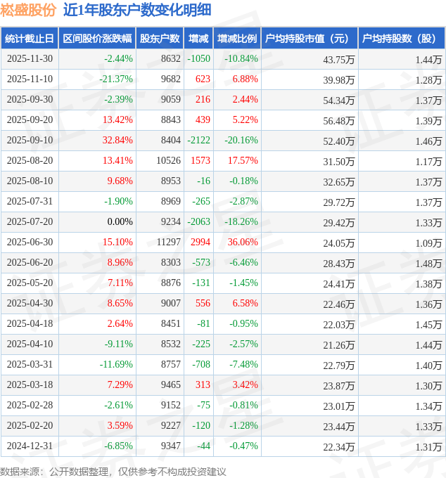 证券之星消息,近日崧盛股份披露,截至2025年11月30日公司股东户数为8632.0户,较11月10日减少1050.0户,减幅为10.84%。户均持股数量由上期的1.28万股增加至1.44万股,户均持股市值为43.75万元。