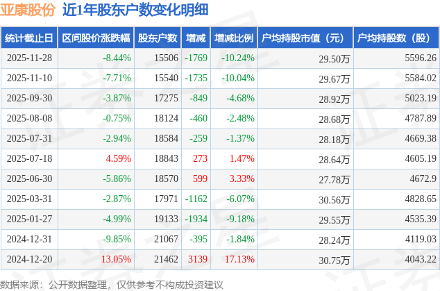 从股价来看,2025年9月30日至2025年11月28日,亚康股份区间跌幅为8.44%,在此期间股东户数减少1769.0户,减幅为10.24%。