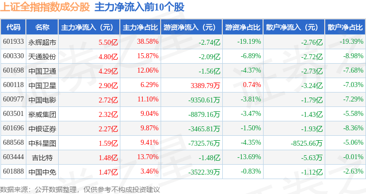 资金流向方面,上证全指(000047)指数成份股当日主力资金净流出合计125.92亿元,游资资金净流入合计33.93亿元,散户资金净流入合计91.99亿元。成份股资金流向详情见下表: