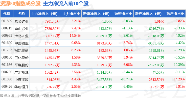 资金流向方面,资源50(000092)指数成份股当日主力资金净流出合计22.87亿元,游资资金净流入合计5.71亿元,散户资金净流入合计17.15亿元。成份股资金流向详情见下表: