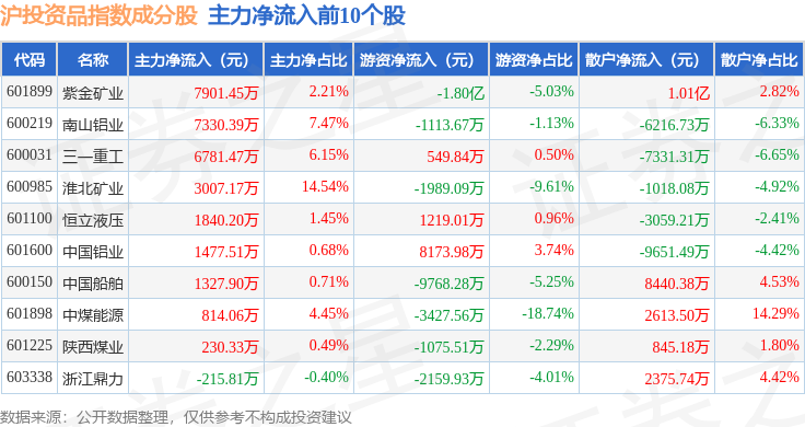 资金流向方面,沪投资品(000102)指数成份股当日主力资金净流出合计21.91亿元,游资资金净流入合计3.7亿元,散户资金净流入合计18.2亿元。成份股资金流向详情见下表:
