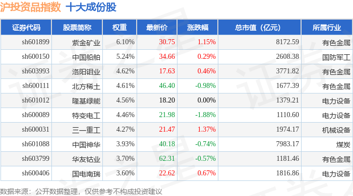 证券之星消息,12月10日,沪投资品(000102)指数报收于7273.64点,涨0.13%,成交492.8亿元,换手率0.93%。当日该指数成份股中,上涨的有28家,浙江鼎力以3.6%的涨幅领涨,下跌的有18家,阿特斯以3.94%的跌幅领跌。