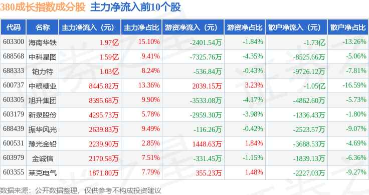 资金流向方面,380成长(000117)指数成份股当日主力资金净流出合计10.29亿元,游资资金净流入合计2.43亿元,散户资金净流入合计7.87亿元。成份股资金流向详情见下表: