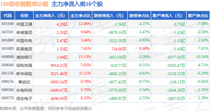 资金流向方面,180动态(000123)指数成份股当日主力资金净流出合计59.52亿元,游资资金净流入合计22.27亿元,散户资金净流入合计37.25亿元。成份股资金流向详情见下表: