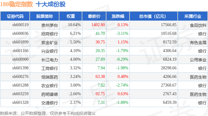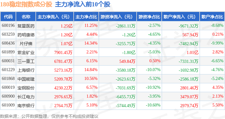 资金流向方面,180稳定(000125)指数成份股当日主力资金净流出合计43.83亿元,游资资金净流入合计6.97亿元,散户资金净流入合计36.87亿元。成份股资金流向详情见下表: