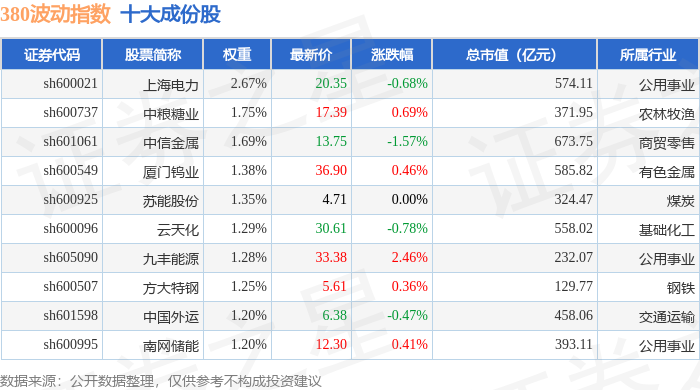 证券之星消息,12月10日,380波动(000130)指数报收于13206.09点,涨0.16%,成交199.37亿元,换手率0.84%。当日该指数成份股中,上涨的有57家,九丰能源以2.46%的涨幅领涨,下跌的有34家,南钢股份以2.82%的跌幅领跌。