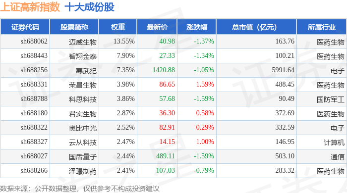 证券之星消息,12月10日,上证高新(000131)指数报收于3569.43点,跌0.39%,成交359.68亿元,换手率1.33%。当日该指数成份股中,上涨的有24家,思瑞浦以3.66%的涨幅领涨,下跌的有26家,当虹科技以2.14%的跌幅领跌。