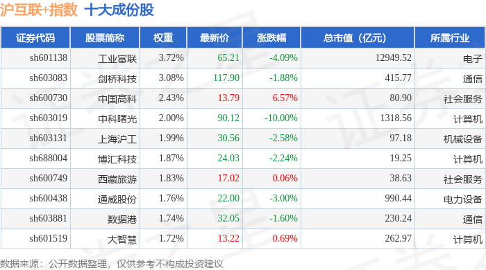 证券之星消息,12月10日,沪互联+(000162)指数报收于3592.69点,跌0.19%,成交503.06亿元,换手率0.95%。当日该指数成份股中,上涨的有35家,一拖股份以7.33%的涨幅领涨,下跌的有36家,中科曙光以10.0%的跌幅领跌。