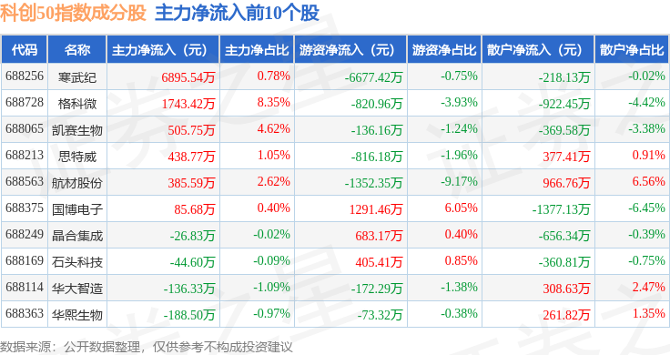 资金流向方面,科创50(000688)指数成份股当日主力资金净流出合计21.82亿元,游资资金净流入合计10.88亿元,散户资金净流入合计10.95亿元。成份股资金流向详情见下表:
