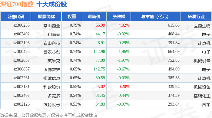 证券之星消息,12月10日,深证700(399010)指数报收于8571.96点,涨0.42%,成交2913.67亿元,换手率2.7%。当日该指数成份股中,上涨的有387家,信邦制药以10.08%的涨幅领涨,下跌的有292家,天源迪科以14.97%的跌幅领跌。