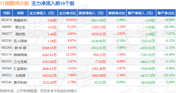 资金流向方面,IT指数(399239)成份股当日主力资金净流出合计18.76亿元,游资资金净流入合计1.25亿元,散户资金净流入合计17.51亿元。成份股资金流向详情见下表: