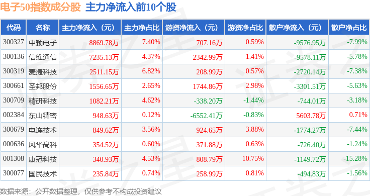 资金流向方面,电子50(399281)指数成份股当日主力资金净流出合计39.37亿元,游资资金净流入合计12.81亿元,散户资金净流入合计26.55亿元。成份股资金流向详情见下表: