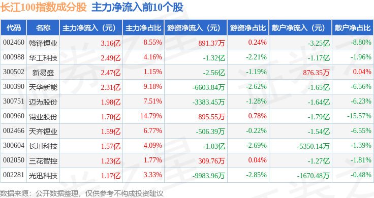 资金流向方面,长江100(399278)指数成份股当日主力资金净流出合计26.12亿元,游资资金净流入合计4.27亿元,散户资金净流入合计21.84亿元。成份股资金流向详情见下表: