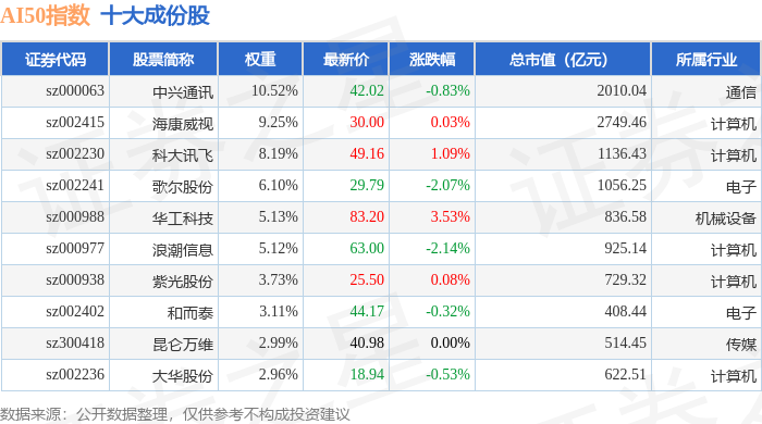 证券之星消息,12月10日,AI50(399284)指数报收于3771.82点,涨0.07%,成交400.1亿元,换手率1.77%。当日该指数成份股中,上涨的有29家,华工科技以3.53%的涨幅领涨,下跌的有19家,国投智能以2.85%的跌幅领跌。