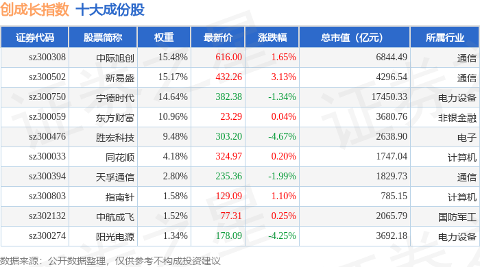 证券之星消息,12月10日,创成长(399296)指数报收于6340.89点,涨0.31%,成交1421.64亿元,换手率2.45%。当日该指数成份股中,上涨的有26家,长芯博创以7.09%的涨幅领涨,下跌的有24家,胜宏科技以4.67%的跌幅领跌。