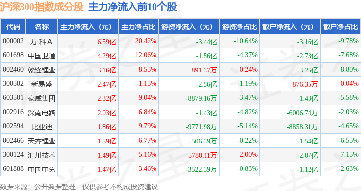 资金流向方面,沪深300(399300)指数成份股当日主力资金净流出合计165.98亿元,游资资金净流入合计38.89亿元,散户资金净流入合计127.09亿元。成份股资金流向详情见下表: