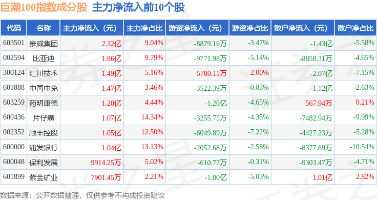资金流向方面,巨潮100(399313)指数成份股当日主力资金净流出合计106.61亿元,游资资金净流入合计29.77亿元,散户资金净流入合计76.84亿元。成份股资金流向详情见下表: